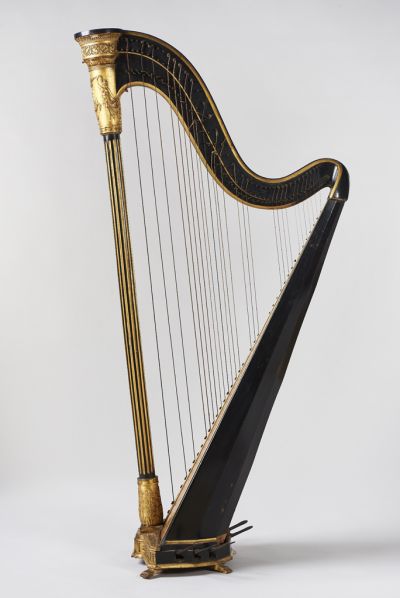 The body of the harp is splayed downwards, formed of seven parts, with four longitudinal sound slots in the middle one. The resonator is framed by a gilt lath. There is a marking below the neck: NADERMAN A PARIS. The harp is equipped with seven pedals, which means that the tuning of the strings can be done by foot instead of hand-tuning. The register of the pedal harp, tuned E-flat Major, is E-flat C. The edges of the neck are gilt. The keys are placed to the right, while the hook action is on the left. The action is engraved with the marking: J. Guibert. The column is decorated with gilt flutes. The gilt head shows a narrow strip of five-pointed stars, surmounted by a relief scene: dancing Graces holding garlands. The hooked pedal harp of one compartment was developed between 1760 and 1800, by French masters. This harp is a developed version of the hooked type the only exception being that it can be tuned by foot in contrast to the hand-tuned hooked harp. With the help of the metal strings and the action in the neck, the seven pedals in the plinth draw the hooks in front of the strings on a little saddle. Thus, by pushing the corresponding pedal, the homogeneous notes of different octaves can be simultaneously raised by a semitone. Henri Naderman and his two sons, Pierre-Joseph (*1773) and Jean-Henri (*1780) were among the most excellent Parisian harp-makers.
