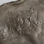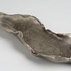 A long, flat bowl of irregular shape and rim. The surface is decorated with a flat relief naked female figure among waves.