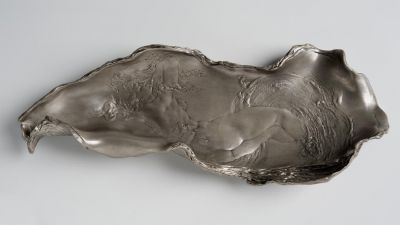 A long, flat bowl of irregular shape and rim. The surface is decorated with a flat relief naked female figure among waves.