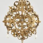 It is a scroll-like open-worked shape, richly illustrated, made of asymmetrical mouldings and pairs of volutes: a champlevé and ronde-bosse enamel pelican mother with spread wings and three nestlings. The topic, the pelican feeding its nestlings with its own blood, is used as an allegory of marital love. The jewel is an engagement pendant favoured in the Baroque period. Its maker also gave an important role to the precious stones: in the mindset of the period the red ruby – 18 pieces of which appear on the work – recalls the idea of a drop of blood, and is the symbol of love as well. The lower part of the pendant is decorated with three hanging pearls. The impact of Daniel Mignot’s jewel plans (active in Augsburg in the 1600s) can be seen on the ornamentation of the object (see here).