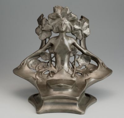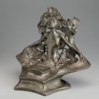 The splaying jar stands on an irregular, pentagonal base. There is a bust of a naked female figure with spread arms, between two pansy stems. Her face is enframed by pansy blossoms. In front of her, the glass ink-well is hidden under a folding cover.
