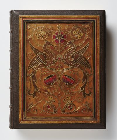 The surface of the front plate of the brown leather binding shows an applied ornament of a unique technique: leather intarsia is placed in the empty compartments of a pierced, gilt copper plate. It is similar to cloisonné enamel in its effect. The con-fronting, symmetrical decoration of the centre shows two confronting griffins sitting on two branches of a flower stem. There are butterflies between the curved, flowery tendrils. The back plate is enframed with blind-stamped lines, just like the compartments of the five-banded spine. The endpaper is made of bright white paper, imitating moiré silk the headband is sewn of blue and white silk thread. The thick cardboard pages of the book are enframed with gold they are prepared to hold photos of various shapes and sizes and are bound together separately, with the help of blue silk stripes. The edges are tooled in gold.