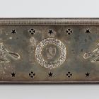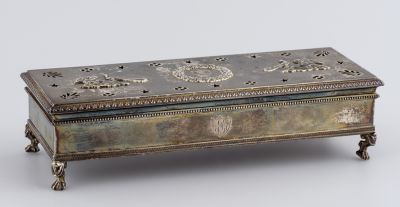 The rectangular box with plain sides stands on four twisted, hoofed feet. There is a framework of string of pearl and serrated motifs on the surface. The long front side shows a fluted coat of arms with the initials A E. The cover is chased with a wreathed medallion, showing the same initials. The cover is pierced, enframed with stars, flowers, and palmettes in the corners. There is a chased cupid, holding a peacock in its hand, on both the right and the left side of the medallion. Marked with impressed town, duty and maker's mark J. Cahier, on the bottom and on the inside of the cover. Accessories: three small, round toilette boxes (IMM Inv.Nos. 56.1398. 1-2-3, Cat. No. 2.11.2).