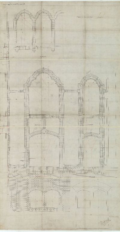 Plan - detail of the facade of Hőgyes (Rákos) street wing from basement till cornice, Musuem of Applied Arts