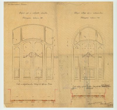 Plan - door with four wings of the Hőgyes (Rákos) street wing leading to the inner courtyard and windbreak doors of the basement, Museum of Applied Arts