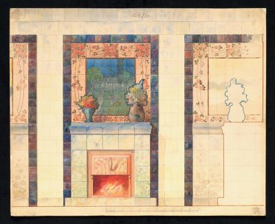 The picture consisted of smaller elements, bordered with one stripe of tiles, their size is similar to that of the fireplace tiles, decorated with wild rose motif. The whole composition is enframed by a deep purple-probably eozin-row of tiles.