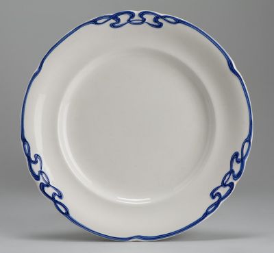The surface of the round plate is flat, rising in a curve towards the slightly wavy rim, which bears the embossed, blue-painted ribbon border. At three places the border creates only a small wave, while at three other places it splits into two and creates looped, dynamic curves.