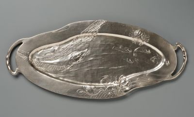 A long, oval shape, with irregular rim, equipped with a handle on the short sides. The surface is decorated with asymmetrical, naturalistic ornaments in bas relief: fish in a net and a crab swimming among water lilies.