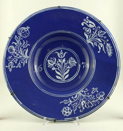 A deep bowl with broad rim. The border of the rim, the border of the interior, and the inside surface are decorated with double lines. The rim is decorated with three different stems of tulip, pomegranate or wheat husk. The middle of the inside shows a tulip stem, dated 1670 on the two sides.