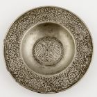 Round. The middle part of the inside and the broad rim are etched. The former shows a crowned double-eagle, the rim has intertwined arabesques and stylized foliate decoration. These motifs were typical of the woodcuts of Southern Germany around 1550. Maker's sign A Preissensin of Nuremberg /+1598/.