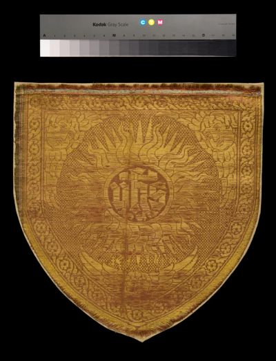 A fine example of figured fabrics woven in a special form for a special purpose. It is decorated by cherubim in each corner and by the initials IHS in the middle surrounded by a flamboyant halo. The border has motifs of rosettes among diagonal leaves.