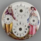 The great turning point of the 18th century, the French Revolution, also brought about changes for clockmakers. A new French revolutionary calendar was introduced as was a decimal numerical system to simplify the keeping of time. A number of special pocket watches were made that indicated time not only according to the traditional system but according to the decimal system, too. As the decimal system was only used in France – and only for 13 years – such clocks and watches are today quite rare (some examples are at the Musee Carnavalet, Paris). The watch in the clock collection of the Museum of Applied Arts was made using this dual system, and indicates not only the hours, but also the days and months. Its escapement is provided with spindles, and there are four smaller dials on its round, white-enamelled dial plate. In the centre, placed one on top of the other, are two dials with the hours indicated 1–10 and I–XII, while on the two sides further dials indicate the days and the months, the traditional names on the left and the French revolutionary ones on the right. The dial with traditional names is hanging on a chain from the neck of a crying woman, while the revolutionary one is held by a blue ribbon on the shoulder of a young girl. The two female figures, painted in enamel, are symbolic. Next to the new calendar we see the well-known allegorical figure of the revolution – known as Marianne – dressed in the colours of the French tricolour and a Phrygian hat. She is stepping on a many-headed monster wearing a crown and bishop’s mitre. The crying woman next to the traditional dial represents the Ancien Regime, with the chains of bondage. The clockwork bears the mark of the workshop belonging to one of the most outstanding clockmakers of the period, Abraham Louis Breguet (1747–1823).