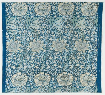The indigo-coloured surface is covered with discharged, white scrolling vine tendrils, enriched with alternating peonies, acanthus leaves and sunflowers placed on four parallel, wavy tendrils. The pattern was registered on 18th October, 1883 it was later realised in printed velveteen and silk fabrics as well. Further pieces can be found in the Victoria and Albert Museum in London, in the Zurich Kunstgewerbemuseum (Inv.No. 6434). Its silk damask companion piece is now in the Whitworth Art Gallery in Manchester. The original designs and wooden blocks can be found in the William Morris Gallery, Walthamstow, while the sketches are in the collection of the Museum and Art Gallery of Birmingham.