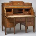The desk stands on eight splayed, prismatic legs ending in pilaster strips with cannelures at the top. In the bottom part there are two side drawers enclosing a middle drawer. The table is equipped with a shutter that rolls up when the flap is drawn out. The shutter is divided into three parts by embedded, rectangular inlays. There are five small drawers and four open shelves inside. A superstructure of three drawers is placed on top of the desk, the middle one rising above the others all three are covered with prismatic tops in tiers. The stand is decorated with guilt bronze cannelures and disks, while the middle part is enriched with broad bronze straps. The inlays of the drawers and the sides are enframed by a string of pearl laths the keyholes are covered with flip-up octagonal bronze pulls.