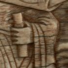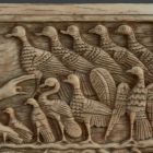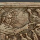 This small ivory panel represents the fifth day of Creation, from the Old Testament book of Genesis. God stands to the right, a scroll in his left hand and reaching out his right to his blessed creations. At the right edge there is cut-off a spiral pilaster which was separated from its other half and from the following scene, a panel of the creation of the animals of the earth, now in the New York Metropolitan Museum of Art. A German inscription on the back of the Budapest panel tells of its origin: “Am 23-ten Sept. 1820 in der Kirche von Salerno, welche Statt nach Neapel die älteste ist”. Presumably put there by its original owner, it proves that the relief of the fifth and sixth days of Creation came from Salerno at that time with several other pieces, and ended up in various collections. The relief belongs to an Old Testament series of furnishings for Salerno Cathedral, consecrated by Pope Gregory VII (1073–1085) in 1084. The intended purpose of the ivory reliefs, which survive in various collections and in the Museo Diocesano in Salerno itself, is still unknown. Researchers dispute whether they are the remains of an antependium, a reliquary, and ambo, a door or a throne, but whatever it may have been, the large object decorated by reliefs of scenes from the Old and New Testaments, apostle- and donator-medallions and ornamental frames, was certainly dismantled before 1575.