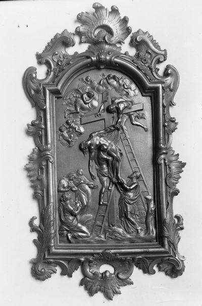 Vertical rectangular, with projecting round gable. The relief shows the Deposition of Christ. Joseph of Arimathea stands on the ladder leaning against the cross, holding the left hand of Christ another figure on the smaller ladder is embracing the body of Christ. On the ground, to the left stand the Virgin and St. John, in front of them is St. Mary Magdalene, on the right a figure holds the legs of Christ. On the ground are a hammer, pincers and a crooked nail. Above the cross are clouds and angels. The frame is gabled with acanthus and palm leaves with a cartouche and acanthus leaves below. Its pair is Cat. No. 1.4.