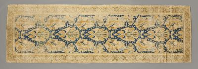 The decorations on 17th-century Cuenca rugs were inspired by patterns from 16th-century silk textiles and rugs. The Spanish rug in the Museum of Applied Arts’ collection belongs to the Brocade series. The field contains large, stylised palmettes in an axially symmetrical arrangement/composition on a blue ground. A vertical series of palmettes, each surmounted by a crown, runs along the central axis of the long, narrow rug and is enclosed by inclined palmettes. These are decorated with ivory, orange, light blue and green floral elements on a pale-yellow ground. The blue ground of the field is filled with a row of tiny, four-petalled rosettes. The border contains a chain created by horizontal "S" motifs connected by rings on a pale-yellow ground.