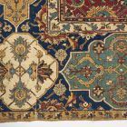 The 16th/17th century Herat Safavid carpet belonged to the museum’s first director, Dr György Ráth (1828–1905). A lawyer and art collector, Ráth furnished his villa at 2 Városligeti Avenue, in Budapest, with more than 1,000 art works, including some oriental carpets. Archive photographs show that the carpet was hung on the wall of the ‘Gems Room’ in the villa. We have no information on the provenance of Ráth’s carpets, but he probably acquired them via art dealers. The scarlet field of the Herat carpet has a pattern of scrolling vines with palmettes and blossoms and an unusual border of cartouches of different colours and shapes on a dark blue field, a design type that is more often attributed to 17th-century central Persia. Despite its fragmentary condition, the design gives the impression of being complete.