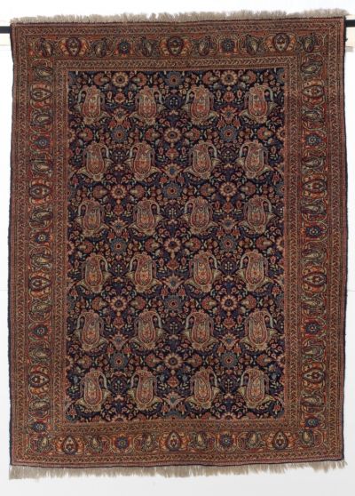 The field shows six rows of four "botchs miriboteh" on a flowery-leafy background. The main stripe of the border is decorated with garlands of rosettes and palmets. Carpets made in Senne and its surroundings were fairly acknowledged and demanded in Europe.
