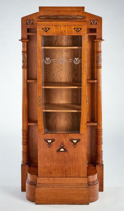 Small cupboard: the articulated bottom plinth curves back on the sides. The standing, prismatic body has glass panels on three sides, flanked by two columns and two small, shelved compartments. The front is inlaid with three stylized butterflies and triangles. The high top corniche of the back is carved and gilt.