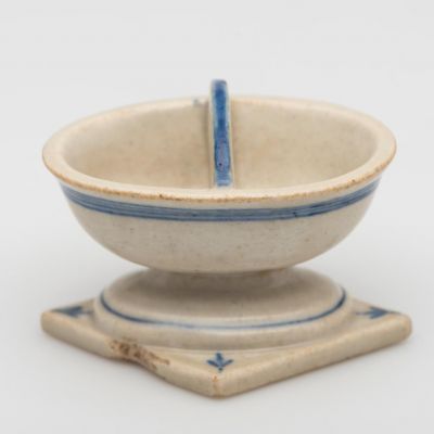 Techniques: assembled mould pressed elements; painted underglaze with cobalt