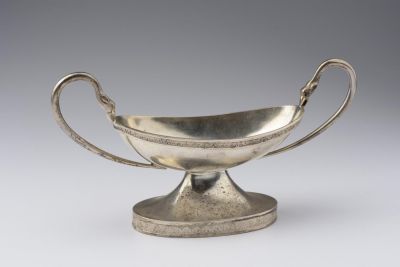 The oval foot rim is engraved with palmettes, supporting a plain, conical part which holds the bowl. The rim of the bowl is decorated with sedge leaves. The two cast and bent handles and in animal heads. Marked on the outer side of the bowl, with a town mark of Lemberg and a faded, illegible maker's mark, impressed below the handle.