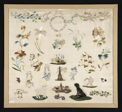 The white silk is decorated with embroidery: a wreath of roses and forget-me-nots among flowery boughs, showing the date 1812 in the middle. The initials F L, shaped of flowers, are on the two sides of the wreath. The patterns below are the following: a yellow flower on a bent brown stem, the middle of which is embroidered in knot stitch white narcissus a flower basket with ribbons ears of wheat a brownish rose stem a pink a yellow bird sitting on a branch a small house standing on green landscape brown and blue flowers a horn of plenty a bow and a quiver a tomb a sheaf tied with ribbon and a rake an urn with a wreath with the inscription: Nanette Koestler, small leaves embroidered in metal thread a lute a lamb in a green back-ground a church among houses a black dog and blue vine clusters with green leaves.