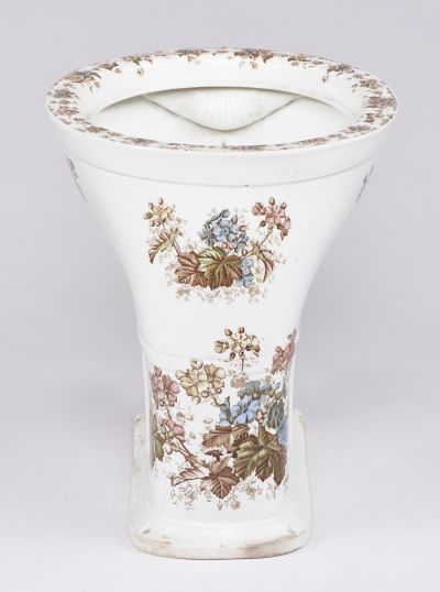 Inscription: | hátul a vízbefolyó-nyílás mellett barna levonóképes matricával az Egyesült Királyság királyi címere, balra koronás oroszlán, jobbra egyszarvú álló alakja között, a címer körirata: HONI SOIT QUI MAL Y PENSE fölött felirat: NEW ROYAL SEMI PORCELAIN, a címer alatt szalagban felirat: DIEU ET MON DROIT |