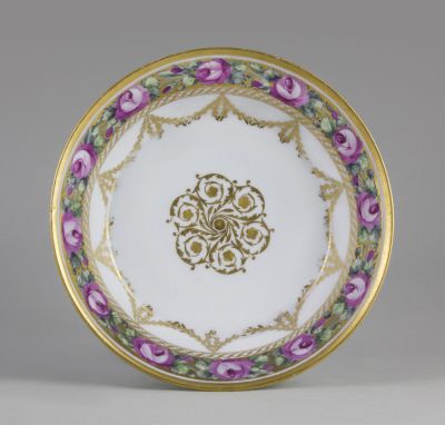 The inside of the slanted, curved, narrow rim shows a line of roses with green leaves, enriched with golden garlands of plaited ribbons, over a gold base. The surface is decorated with a golden rosette. Marked on the bottom, in blue underglaze, with the crowned marking of the Petersburg factory, forming the initials of Czar Paul I.