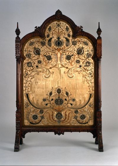 The embroidery follows the shape of the frame, leaving out the middle of the screen. The motifs follow the Turkish-style patterns of seventeenth century Hungarian embroideries. At the bottom, in the middle there is a flower stem created from three pomegranates placed one above the other, with large, slashed leaves, scrolling tendrils enriched with rosettes and tulips springing from it. The three curves of the top part shows a symmetrical bunch of flowers in the middle, with scrolling, flowery tendril on the sides. Architect Géza Györgyi (1851-1934) first worked in the office of Miklós Ybl, participated in the construction of the Castle Bazaar and the Opera. Later he also took part in the construction of the royal palace, where, after the death of Ybl, he was assigned assistant of Alajos Hauszmann.