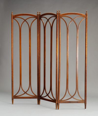 The screen originally consisted of four parts today it lacks one of the parts and the silk upholstery. In its present state, the screen consists of three identical sections. The frame of each section is created of two cylindrical posts on the sides, ending in turned balls, a curved top and a straight bottom. There are two square rods on each side of a section, bent in a curve, crossing each other at the top and bottom.
