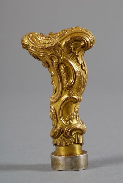 The rich form resembles the head of a walking stick the surface is decorated with cartouches and flowers. There is a round seal on the bottom, with an engraved coat of arms, showing two spread wings over a coronet - yet unidentified.