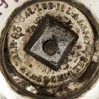 The domed part of the round base is decorated with rosettes and garlands of fruit the rim of the spindle-shaped top has cartouche and garland motifs. The vase-shaped stem is chased with masks in cartouches the bowl is fluted and chased with masks. The rim of the bowl is decorated with framed foliage. The stem is supported by a 20 coin of Ferdinand V from 1847. Maker's sign VN, as yet unidentified.