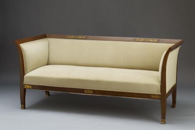 The settee stands on four prismatic feet with bronze shoes. The seat, the curving sides and the back support of the same height are constructed in one piece and upholstered. The seat rail and the back support are mounted with green-gold.