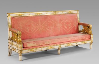 In France, the empire style was characteristic from the time of the Consulate (1799–1804) until the Bourbon restoration, and in aristocratic homes right up until 1830, owing to the fact, among others, that Napoleon, who was crowned emperor in 1804, wished to revive the magnificence of the Roman emperors. The two greatest architects and interior designers of this period, Charles Percier (1764–1838) and Pierre Francois Leonard Fontaine (1762–1853), had published their work Recueil de decorations interieurs as early as 1801. Those giving the biggest commissions were Josephine Bonaparte (1763–1814) and Mme. Recamier (1777–1849). 169 Their furniture designed by Percier and Fontaine already heralded the new style: empire. The emperor’s style of furnishing was adopted by his widely distributed relatives, and spread across the whole of Europe. The white-and-gold furniture ensemble shown here probably belonged among the one-time furniture and fittings of the Amsterdam palace of Bonaparte Napoleon, King of Holland (1806–1810). The cylindrical legs and frame of the settee are decorated with flat-carved gilded palmettos, leaves and rosettes, and the upholstered armrests are supported by winged lions. The high, angular seat-cushions of the chairs without arms are rather hard and uncomfortable. The principal characteristics of sets of seating of this kind are a programme-like ceremoniousness, cool pathos and theatricality. All this was lightened by the one-time beauty of the Lyon silk fabric, which was woven to measure and made expressly for the furniture. From the 1930s until the late 1940s, this set was in the Rojtokmuzsaj.