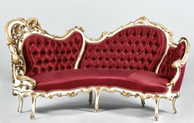 The settee stands on seven short, carved and curved legs. The seat is concave, the seat rail is carved with Rococo motifs. The asymmetrical back support is divided into three parts. The curved, wavy wooden frame is pierced, carved with Rococo motifs, enriched with white painting and gilt parts. The settee comes from the Bohus castle of Vilagos. Its style and maker is identical with that of the console tables, mirrors and table described earlier.