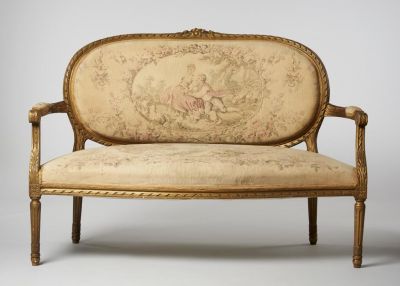 The sofa stands on four fluted, cylindrical legs. Its upholstered seat is slightly curved at the front and rounded at the back. The lying oval back is also upholstered, in a carved frame, which is carved with leaves all round and decorated with a ribbon ornament springing from a bunch of roses at the top. The arm supports are carved with bay and acanthus leaves, the arm rests are upholstered. The upholstery show pastoral scenes. The structure of the armchairs is very similar to the settee its back is almost circular. The upholstery of the seat shows a landscape with a bridge, the back is decorated with a shepherdess figure. Both the carving and the structure of the suite is extremely refined. According to Barbara Mundt (see Mundt 1981) Louis XVI furniture made at the end of the 19th century were fairly light and deli-cate and were popular all over Europe at that time. Furniture similar to this suite were made for the interiour of the royal palace in the workshop of Miksa Gelb and Son. (see Alajos Hauszmann: A királyi vár belső kiképzése es iparművészeti felszerelése /The Interior Design and Artistic Equipment of The Royal Palace/. In. MI 1903 pp.161- 180.)