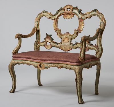 The settee stands on four curved legs, that once ended in knots. The rail under the upholstered seat is decorated with pierced carving of shell, volute and leaf motifs. The arm-rests are formed of two bent, S-shaped pieces. The pierced back is bent, jointed, with rich carving of shell and leaf motifs. The painted, wooden framework of the settee is decorated with zigzag lines and spots.