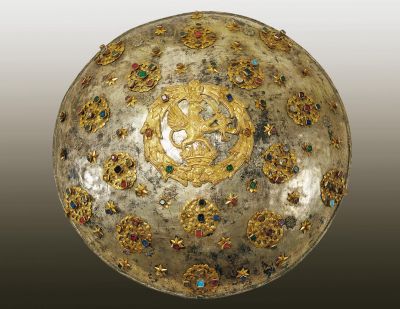 Round, slightly sloping, with an applied ornamen-tation in the central field. 1. On one of the shields there is a griffin holding sword — a heraldic motif of the coat-of-arms of the Esterhazy family — it is surrounded with a wreath, chased and embossed. 2. On the other shield there is an engraved ornamentation stylized flowers and foliage on a round plate. Applied fittings with precious stones — 15 pieces — and star-shaped, riveted settings cover the surface. The set coloured beads are imitations of emerald and garnet. Presumably one of the two objects is mentioned in the following item of the 1725, inventory of the Esterhazy treasury in Frakno: "A silvered shield, set with stones, with the coat-of-arms of the Esterhazy family" (Inventarium Thesauri Fraknensis Anno 1725. Almarium Sub. Nris 9- et lo. Nro. 4. — Inventory of the Museum of Applied Arts 236/1957). The item of the inventory is published and it is assumed that these weapons must have belonged to the equipment of the army taking part in the siege of Buda.