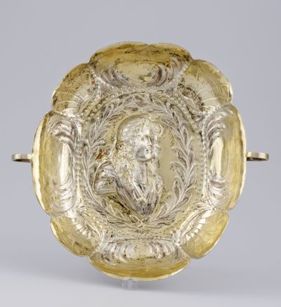 Oval, octafoiled, with shell and foliage decoration on the foils. In the middle, in a festoon, are the profile busts of Leopold 1st, Holy Roman Emperor and Claudia Felicitas, his second wife. It has two volute-shaped handles on two sides. Marks on the bottom.