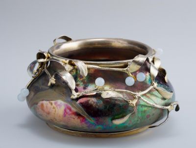 In ceramics, historicism attempted to reformulate the old shapes and decoration of pottery and to revive long-forgotten craft techniques. The experiments with oriental raw materials and various glaze techniques were consummated in Art Nouveau. One of the most characteristic of these techniques was metal lustre, a procedure which started in the Middle East and passed via the Andalusian Moors to Italy. At the zenith of the Renaissance, it was employed to masterly effect in Gubbio and Deruta, but was subsequently forgotten for a few hundred years. In the 19th century, many European potters successfully experimented with metal lustre – Vilmos Zsolnay (1828–1900) in Hungary and Clement Massier (1844–1917) in France. Massier studied in his father’s Vallauris pottery workshop, and then took it over together with his brothers. In 1883, he set up a new workshop in Golfe Juan, where he made his first metal-lustre glazed ware, for which a few years later, in 1889, he won the Grand Prix at the Paris World’s Fair. Massier’s finely-modelled, little jewel-like ceramics were often set in silver, with finely chased foliate ornamentation – mistletoe branches or ivy stems – winding round the mouth of the vessel. A special feature of this metallically reflective, crimson-, purple-, green- and blueglazed bowl is the use of another material, glass. The refraction of the opaque glass beads makes for a lifelike imitation of tiny berries.