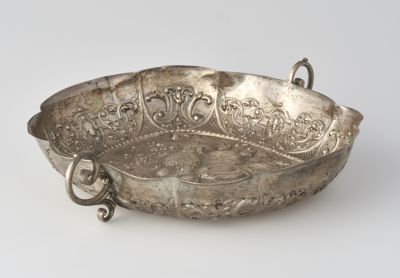 Oval shaped, its sides are divided by four larger and four smaller alternating foils. On the interior of the rim is a chased ornamentation of a combination of foliage and bands — the so-called "Laub- und Bandlwerk" motif. In the interior is a bunch of fruit. On the longitudinal sides are two cast, voluted handles. The master's and the city's marks are on the rim.