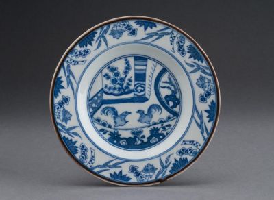 Techniques: | brown-glazed; decorated with transfer print (decal); mould thrown (presumably); painted underglaze with cobalt |