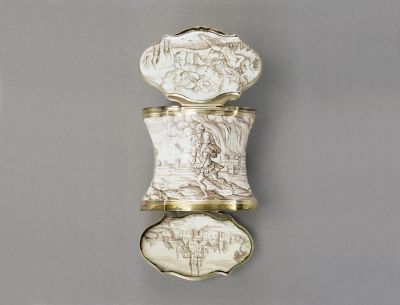The two covers of this double compartment snuff box open in the opposite directions they are attached to the body with hinges. The body is divided into two parts in the middle. The cylindrical body stands on an oval base its sides are raised. Its entire surface is covered with grisaille scenes, that is, enamel paintings made with various shades of gray on a white base. There is no direct connection between the various mythological scenes. The outside of its lid features the one-hundred-eye Argus, who on behalf of the jealous goddess Hera guards the love of Zeus, Io, turned into a cow. Argus is alluded to by the peacock, whose feathers are decorated with his “eyes”. In the inside of the cover there is a picture of a town – a church, a bastion, and single-storied houses. On the exterior of the bottom lid there is a young hero with a dragon killed by arrows in the inside is a scene of a town surrounded by a wall strengthened with bastions and gates, a two-tower cathedral, one-storied and larger buildings. On the sides of the box the illustrations of Cato stabbing himself with his sword and Aeneas fleeing from burning Troy, carrying his father, the old, paralysed Anchises can be seen.