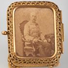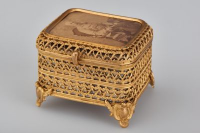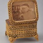 The rectangular casket of rounded corners opens on hinges. The centre of the top is decorated with the photograph of Francis Joseph. The bottom is made of cardboard, imitating leather. The rim of the top is lined' with a row of pierced heart and foliage motifs the same motifs create the sides, repeated twice. The casket is lined with silver cardboard on the outside and with pink silk on the inside. The four feet form a cartouche, combined with shells and leaved boughs. The opening peg is ear-shaped.