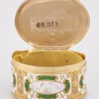 When decorating this oval casket, the goldsmith applied a wide variety of enamel painting methods, besides the coloured gold inlays on the top and on the edges. The cover of the hinged casket is decorated with a frame of delicate leaves. Inside the frame there are four tulip motifs varied by four scroll-shapes. The middle of the top, the side of the box, and its bottom feature six elongated, grisaille enamel paintings painted with gray against a light pink background. Two of them are decorated with birds one depicts putti playing with a goat, with a basket of flowers and with spindles, and another one a smoking sacrificial vessel with pigeons and flowers. The surface between the enamel pictures and the framing scrolls is filled with dark green basse-taille enamel the space between the scrolls and the tulips is decorated with white en plein enamel painting. The pictures on the side of the casket are separated by four fields. Their plastic decorations – a cordon festoon, guitar, bagpipe, drum and a book with torch – were soldered to the surface later. There are impressed proof marks on the cover and the bottom of the casket.