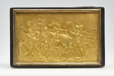 A rectangular box of horn with a silver band inside. The cover shows a relief of gilt bronze, placed under a glass plate. It depicts a battle scene with many figures. The inscription of the scene is NAPOLEON BLESSE DEVANT RATIS- BONNE LE 23 AVRIL 1809 (Napoleon wounded before Regensburg, on the 23rd April, 1809).