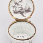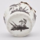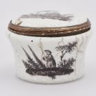 A round box with a splayed body. It is decorated with pictures painted by Schwarzlot, against a white background. The cover shows a genre picture: a dallying couple in scenery. The sides show four female figures among trees and shrubs. The bottom is decorated with plants.