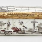 The prismatic box is decorated with the miraculous levitation of St. Peter of Alcanthra, who died in 1526: while praying in front of the statue of Virgin Mary, the saint begins to float in the air. The inside of the cover depicts St. Peter, emerging from a cloud, holding a lily in his left hand. The two shorter sides of the box show a building and a grave the two longer sides are decorated with St. Peter and his companion praying in front of a cross, and the sitting figure of St. Peter.