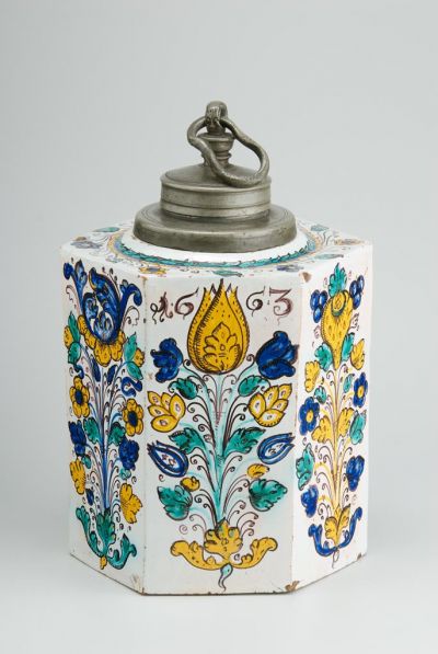 Hexagonal shape with curving top and a screwed upper rim of pewter. The top can be screwed into the lid, and is in the form of two male heads. The sides are decorated with stylized flower stems. The top has leaved wreaths and small flowers along the upper rim. Painted in blue, green and yellow, contoured and shaded in manganese, on a white background. Dated 1663 on two sides of a flower stem.